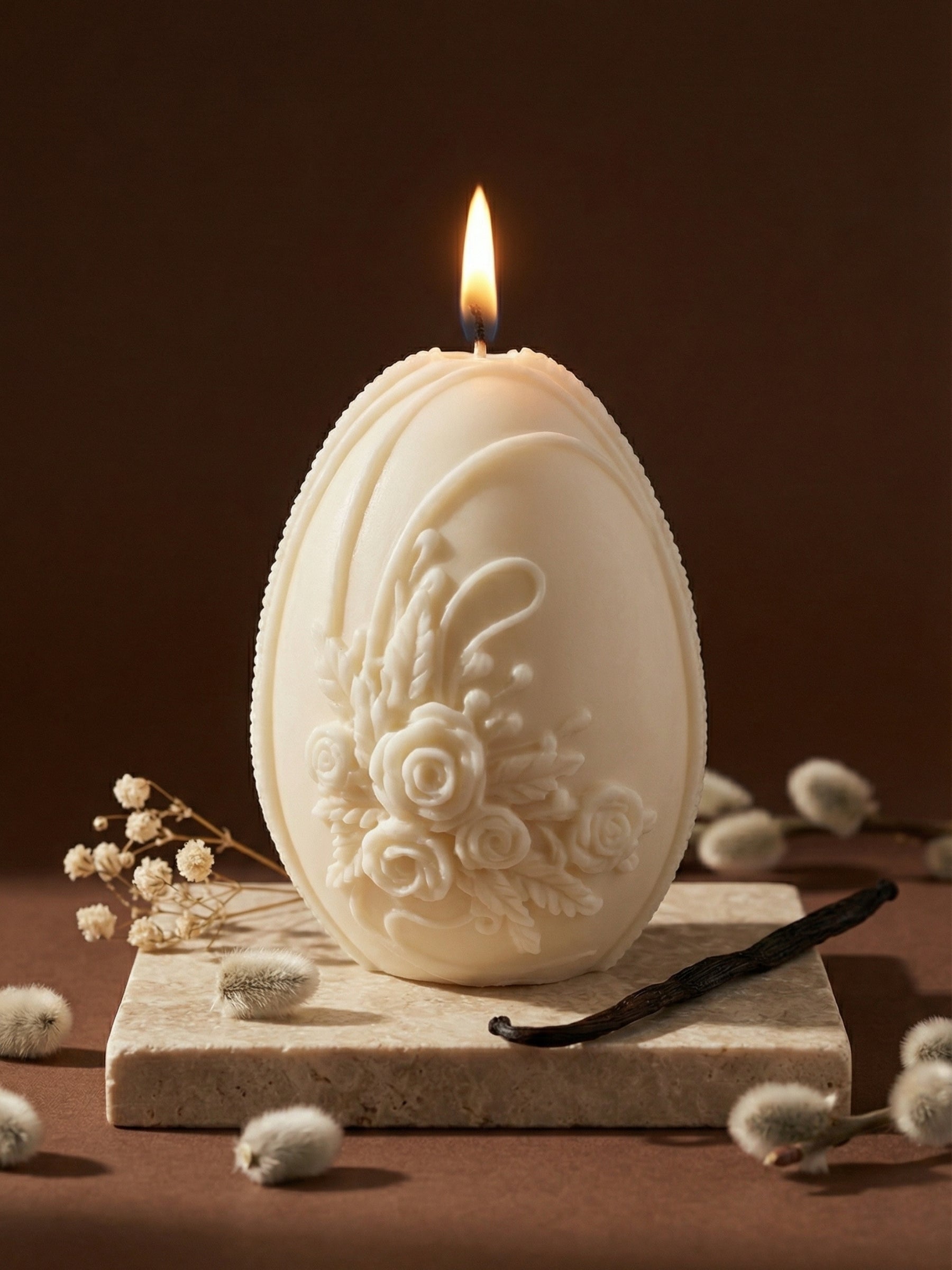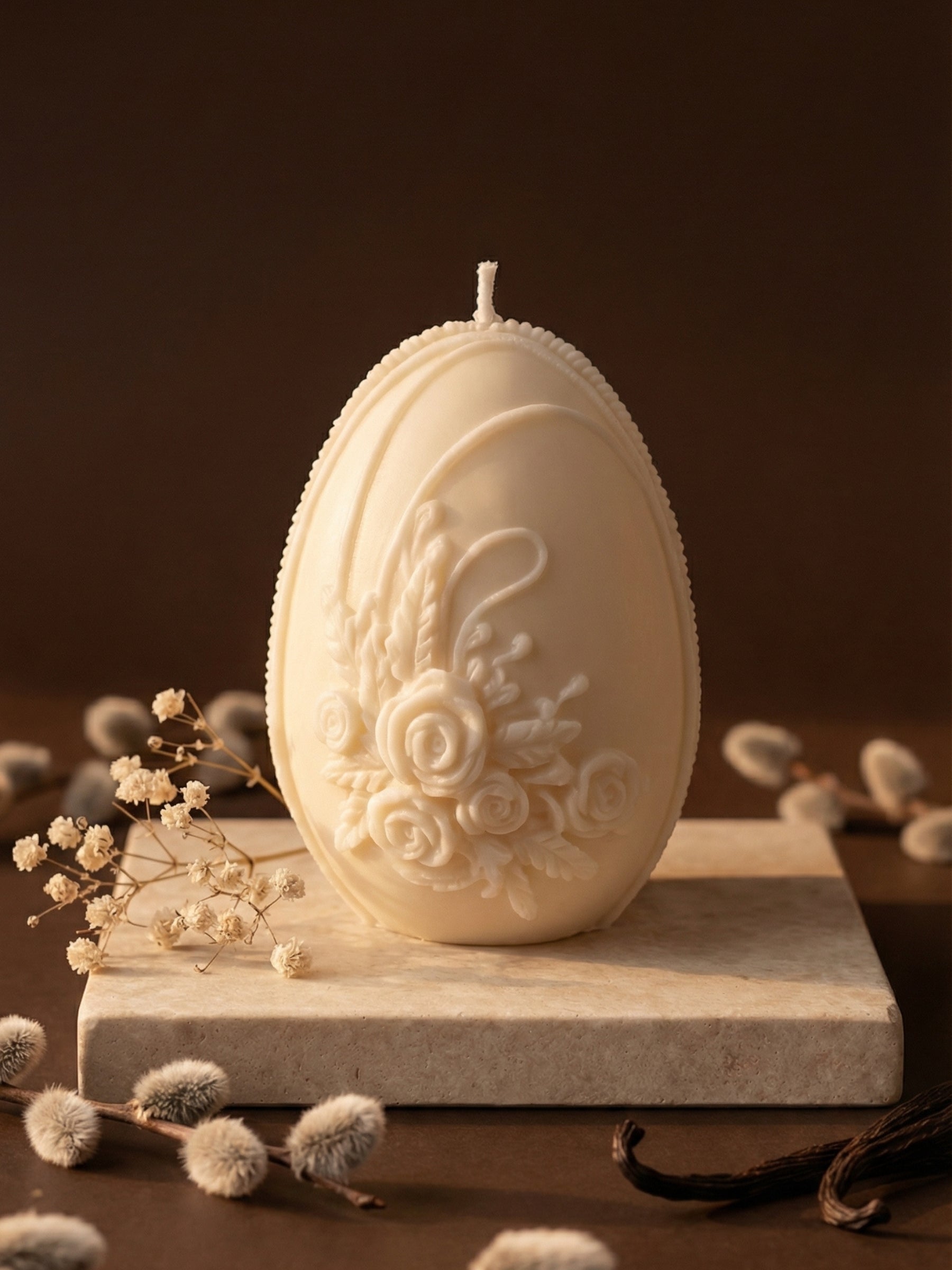 Its sculptural silhouette reveals a composition of softly embossed florals — each detail unfolding across the surface like petals arranged in harmony. The egg-inspired form subtly reflects themes of renewal and light, often associated with spring, yet remains timeless in its presence.